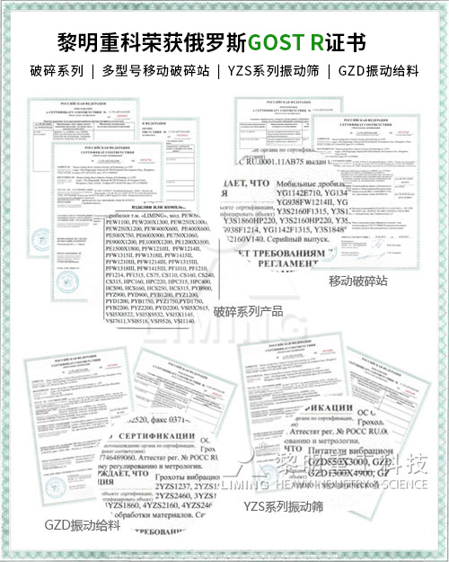 近日,黎明重工科技破碎磨粉系列的百余種型號產(chǎn)品通過了俄羅斯質(zhì)量認證—GOST認證,成為繼CE認證后的第二個國際質(zhì)量認證。